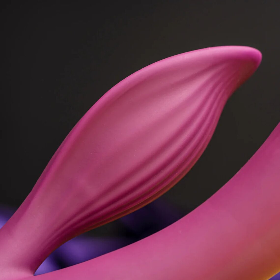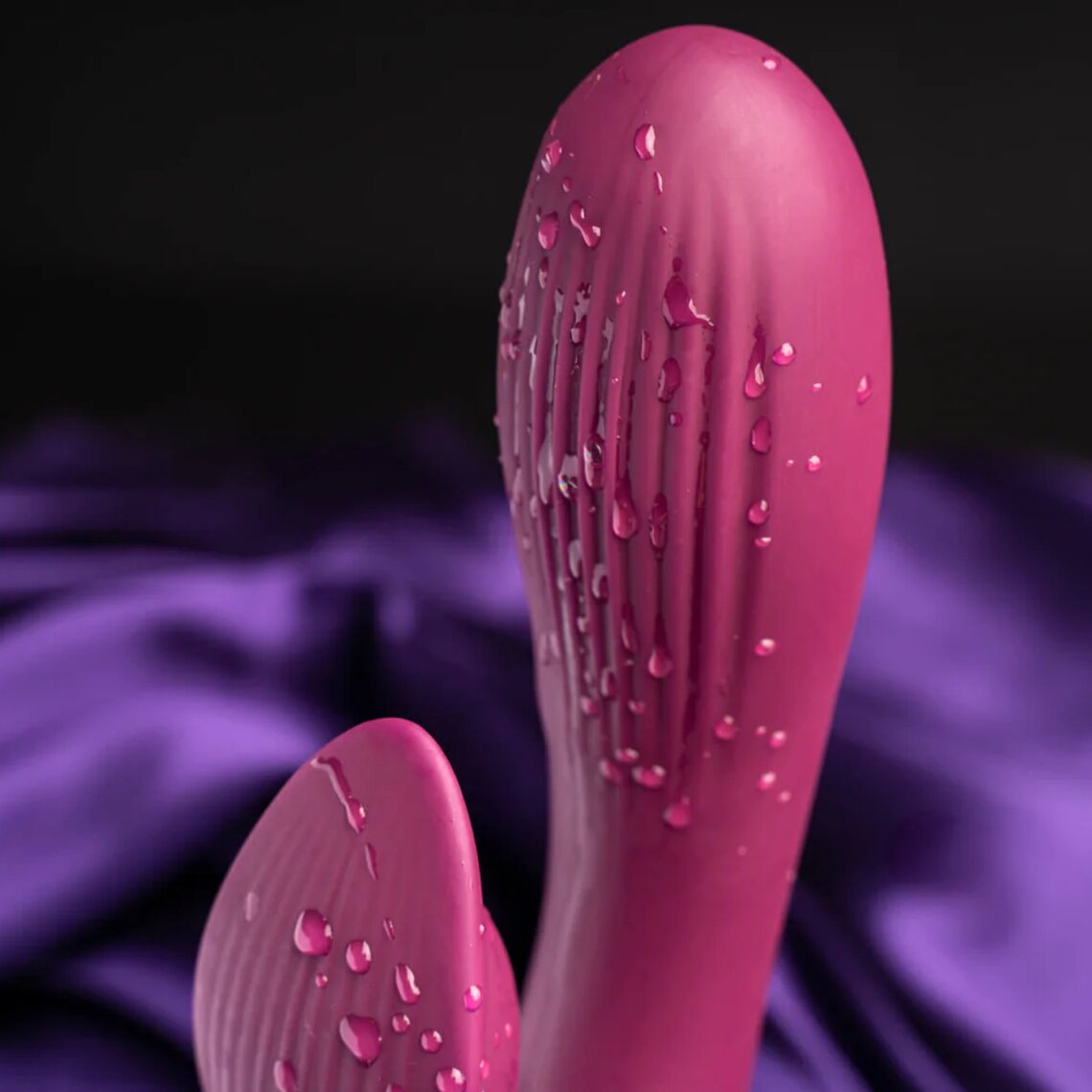 Lila Häschenvibrator mit abgerundeter Spitze zur Stimulation von Klitoris und weiblichem G-Punkt.