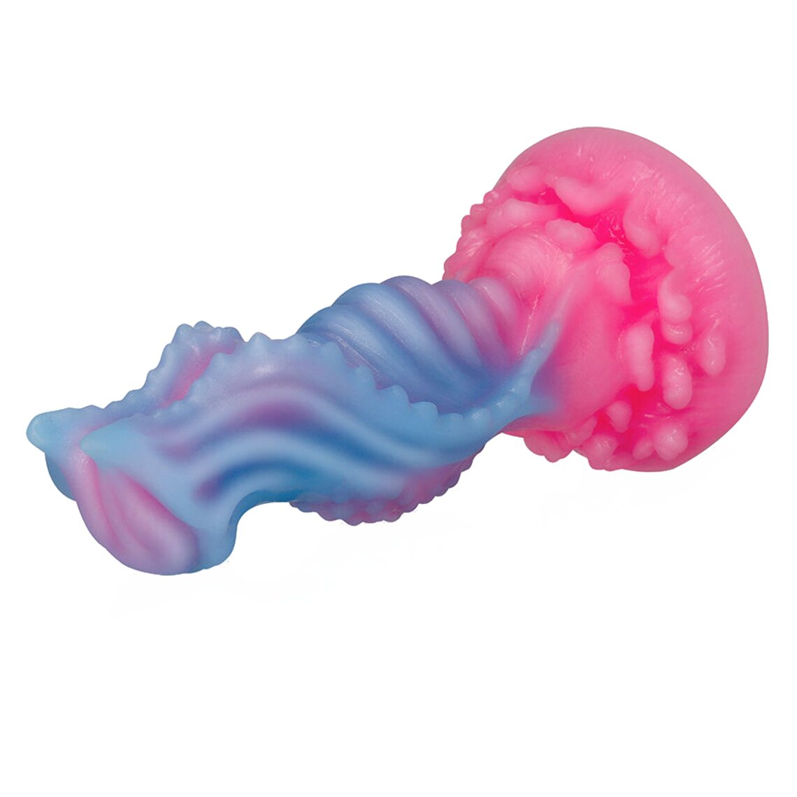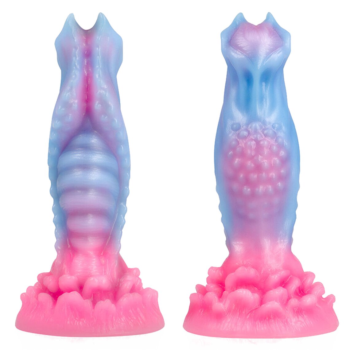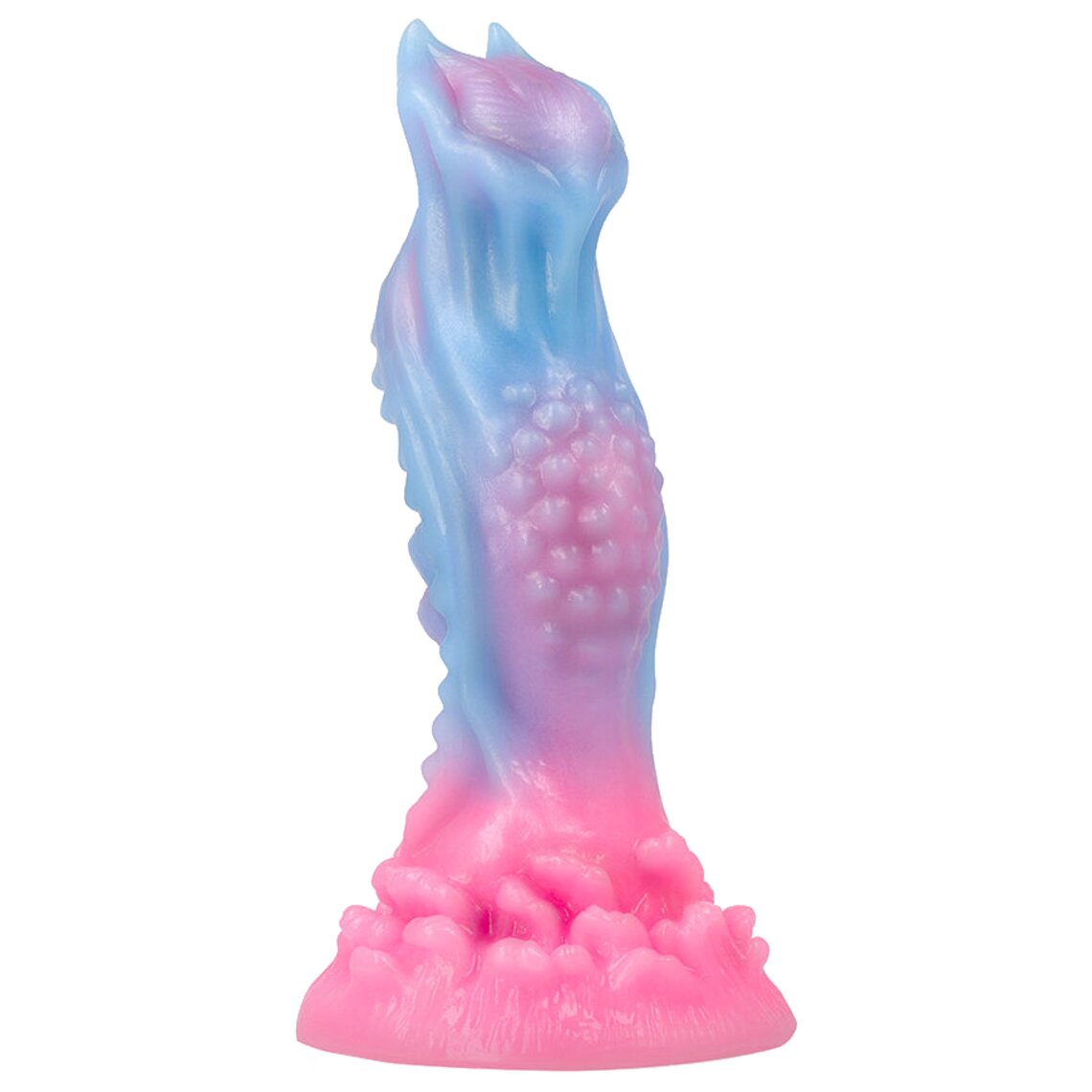 Fantasy-Dildo inspiriert vom Morgengrauen. 18,5 cm hoch. Hellblau und Rosa.