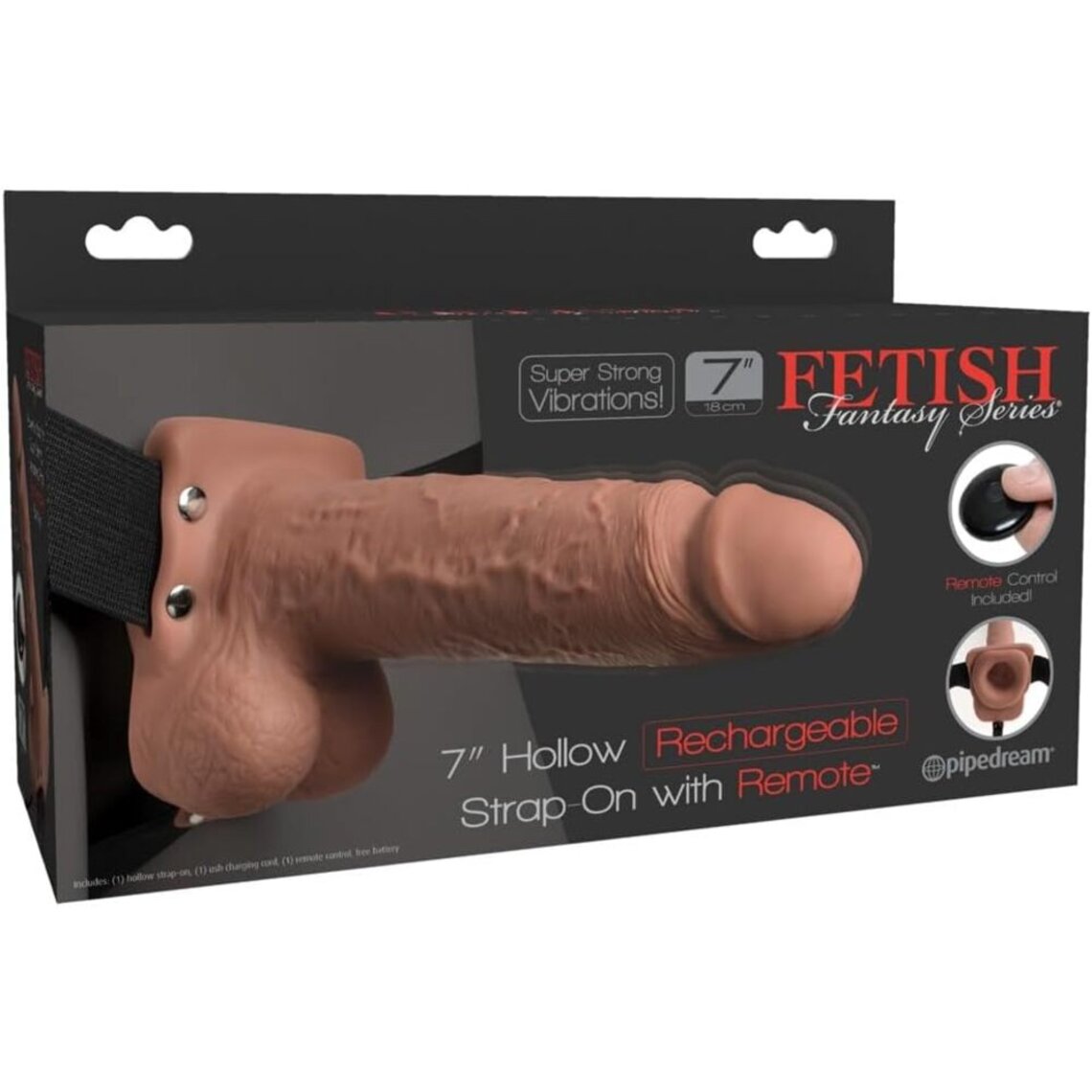 Sexgeschirr mit hohlem Vibrationsdildo, 20 cm lang und 5 cm im Durchmesser.