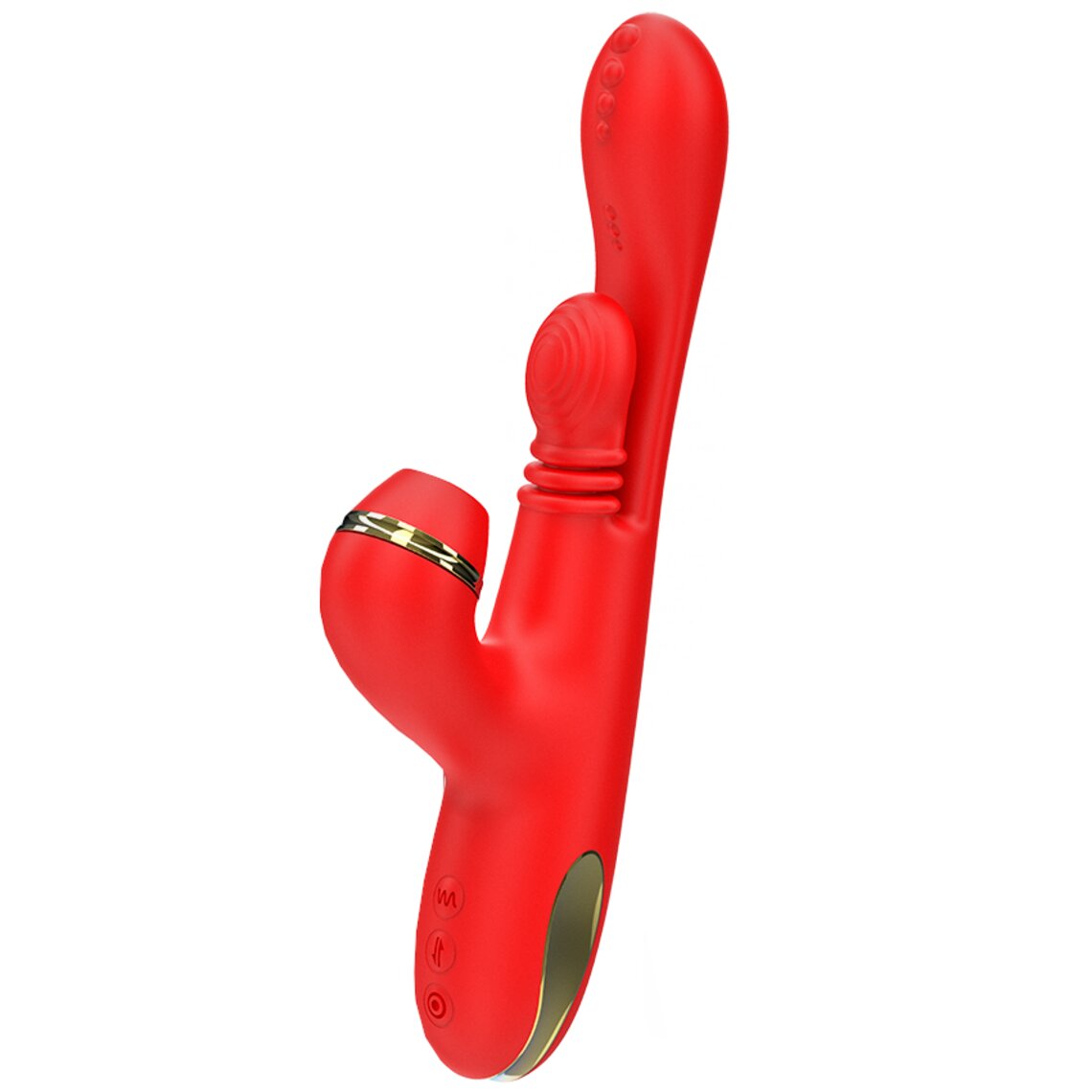 Roter Vibrator mit austauschbaren Aufsätzen. 3 Funktionen: vaginale Vibration, Klitorisstimulation und G-Punkt-Stimulation.