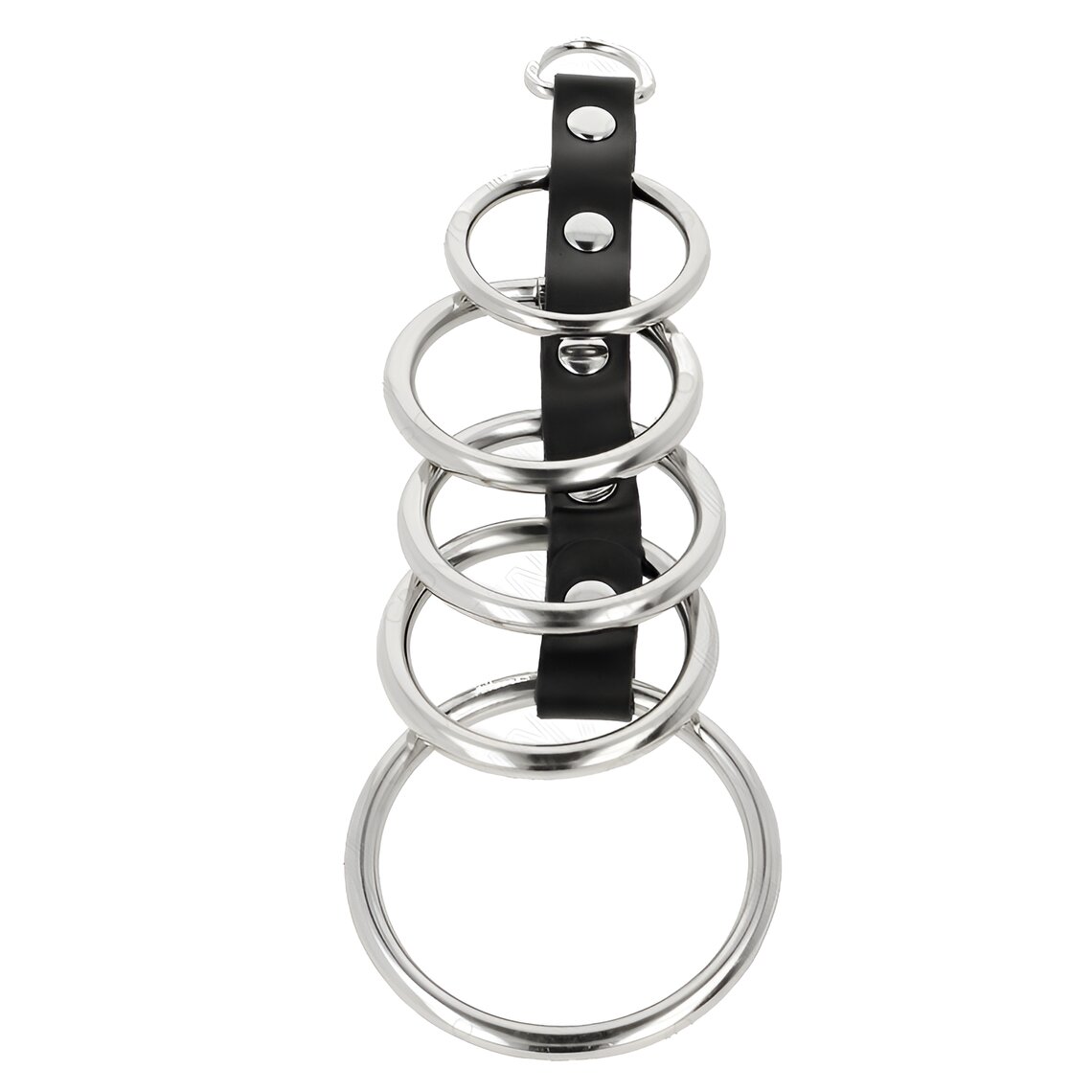 Accessoire mit einer Struktur aus Metallringen, die durch einen Kunstlederstreifen verbunden sind und alle Elemente ausgerichtet halten. Sein progressives Design ermöglicht es, den Penis mit Ringen unterschiedlicher Durchmesser zu umschließen und so eine feste und stabile Struktur zu schaffen.
