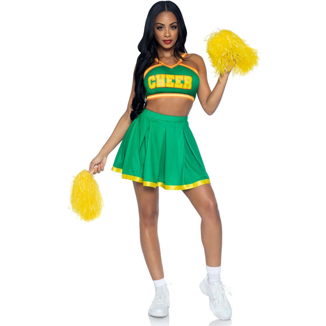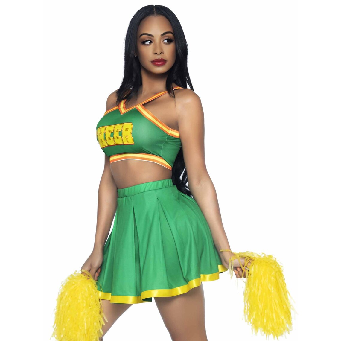 Cheerleader-Kostüm mit grünem Rock und Top mit gelben Details.