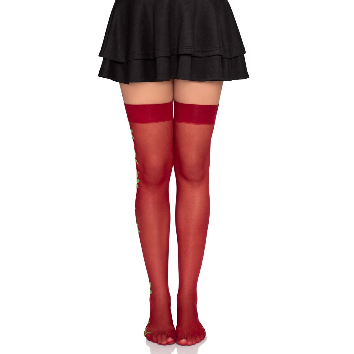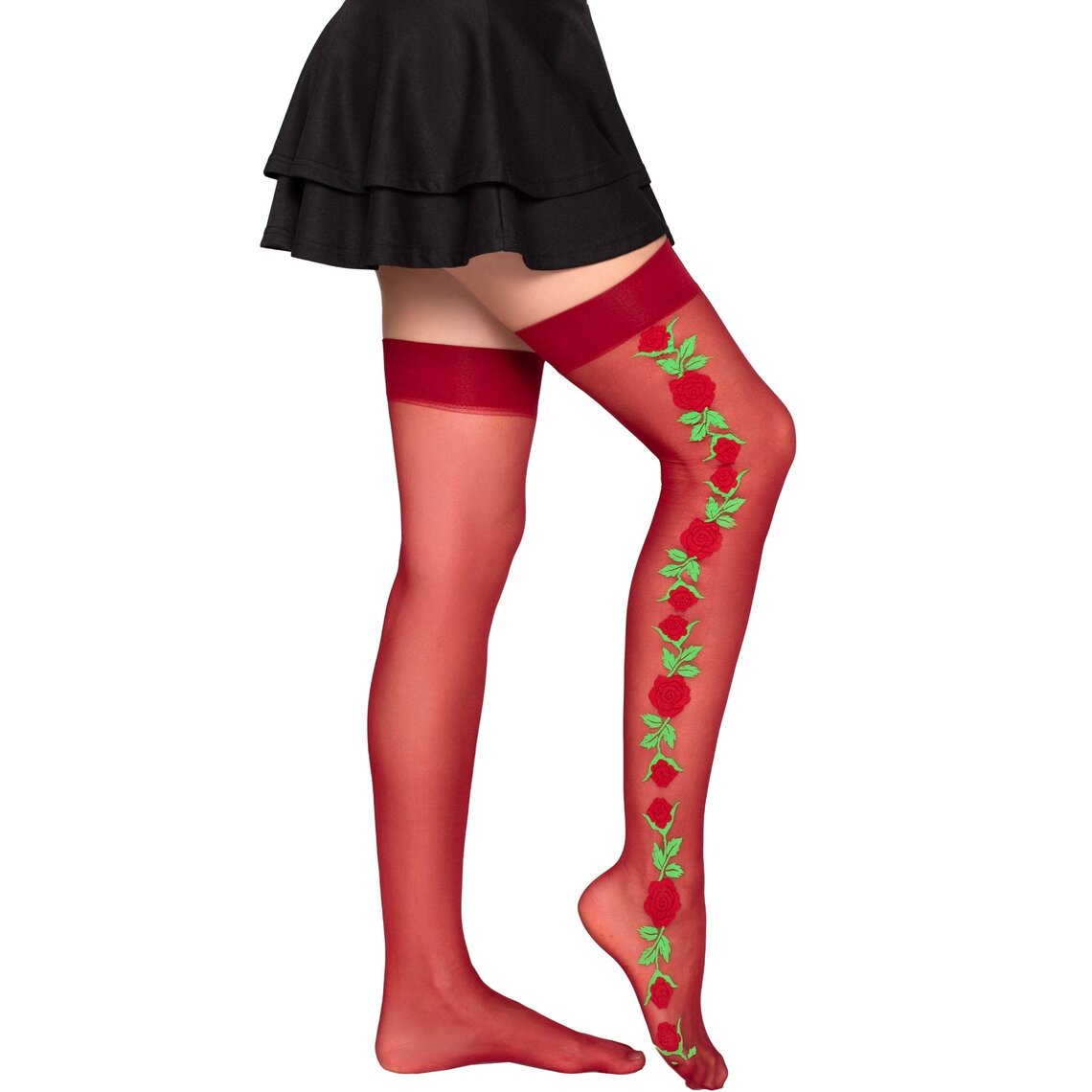 Verführerische karmesinrote Strümpfe mit seitlich eingearbeiteten Spitzenrosen.