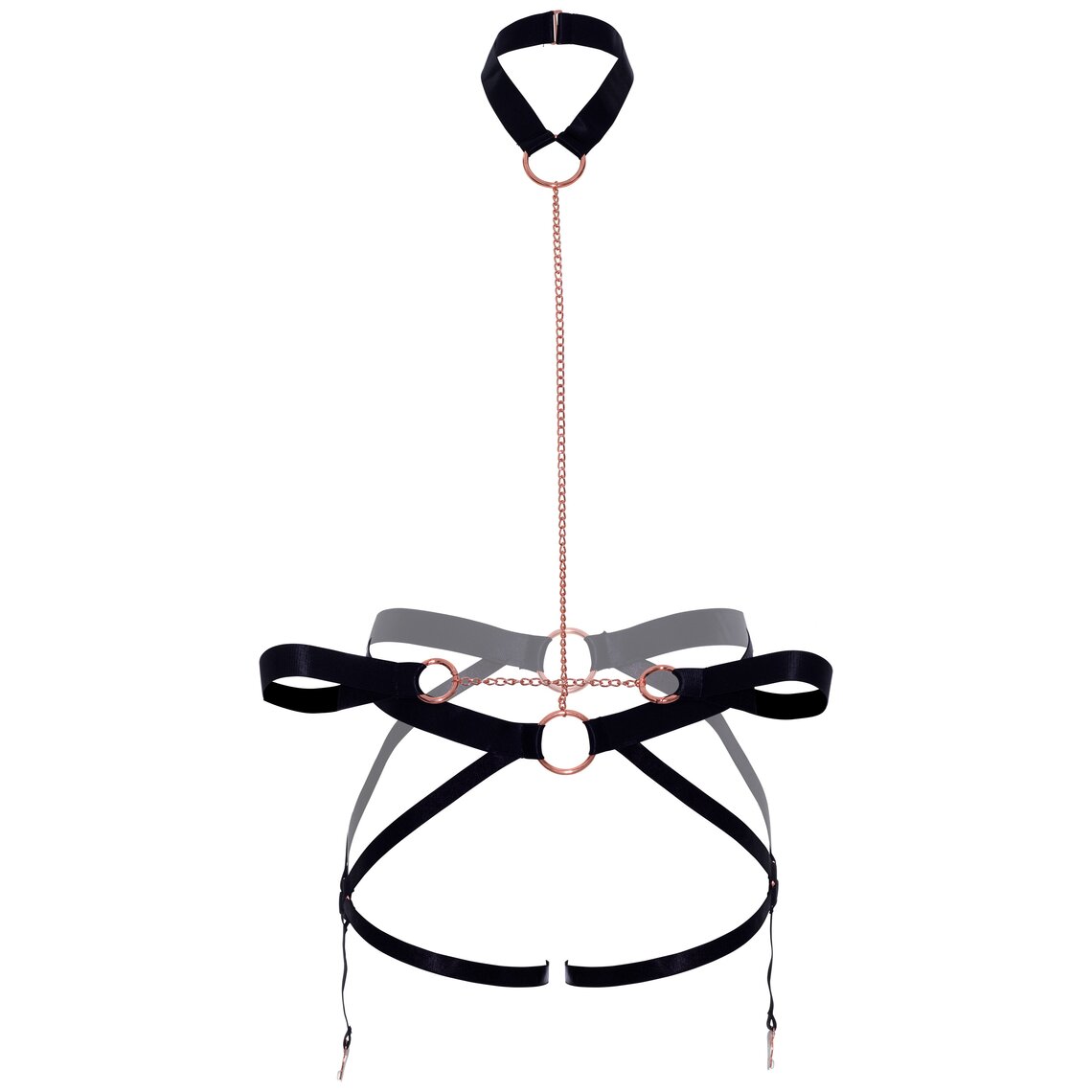 Präsentieren Sie Ihre schönsten Seiten mit diesem auffälligen Choker-Körperketten-Harness-Set von Leg Avenue. Dieses Bondage-Set besteht aus einem dehnbaren Satin-Po-Harness mit seitlichen Strumpfbändern, roségoldenen Beschlägen und passenden Handfesseln. Dieser verführerische Dessous-Look sorgt für einen aufregenden BDSM-Abend mit Ihrem Partner.