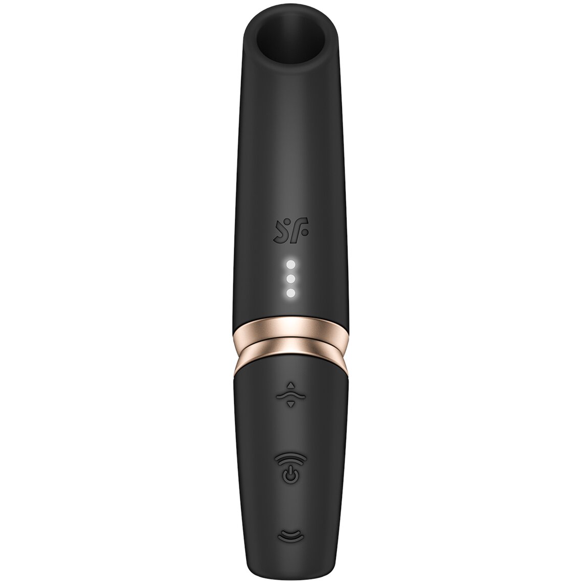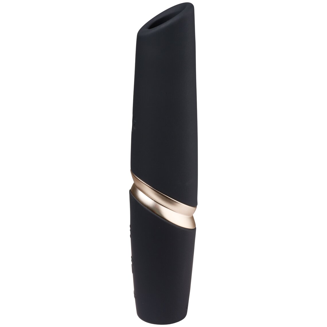 Schwarzer Taschenvibrator, der die Klitoris mit Luftdruckwellen stimuliert. Sehr diskretes Lippenstiftdesign.