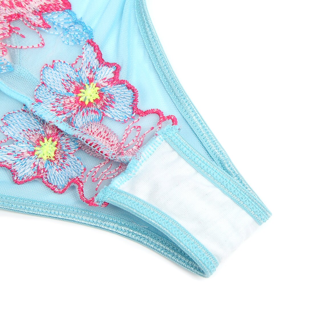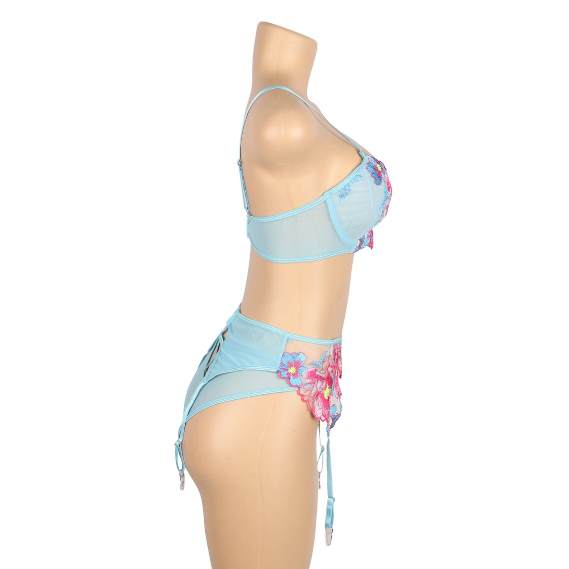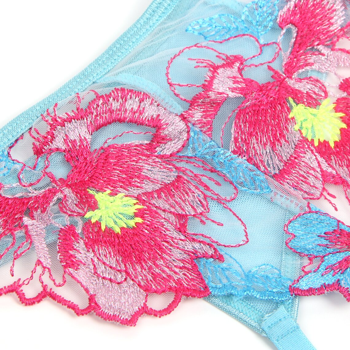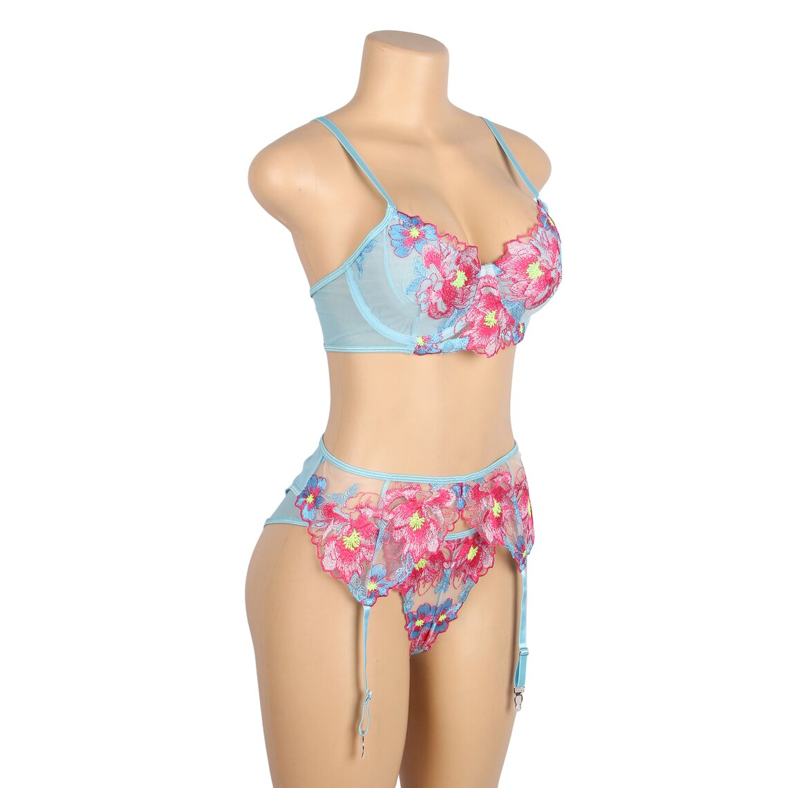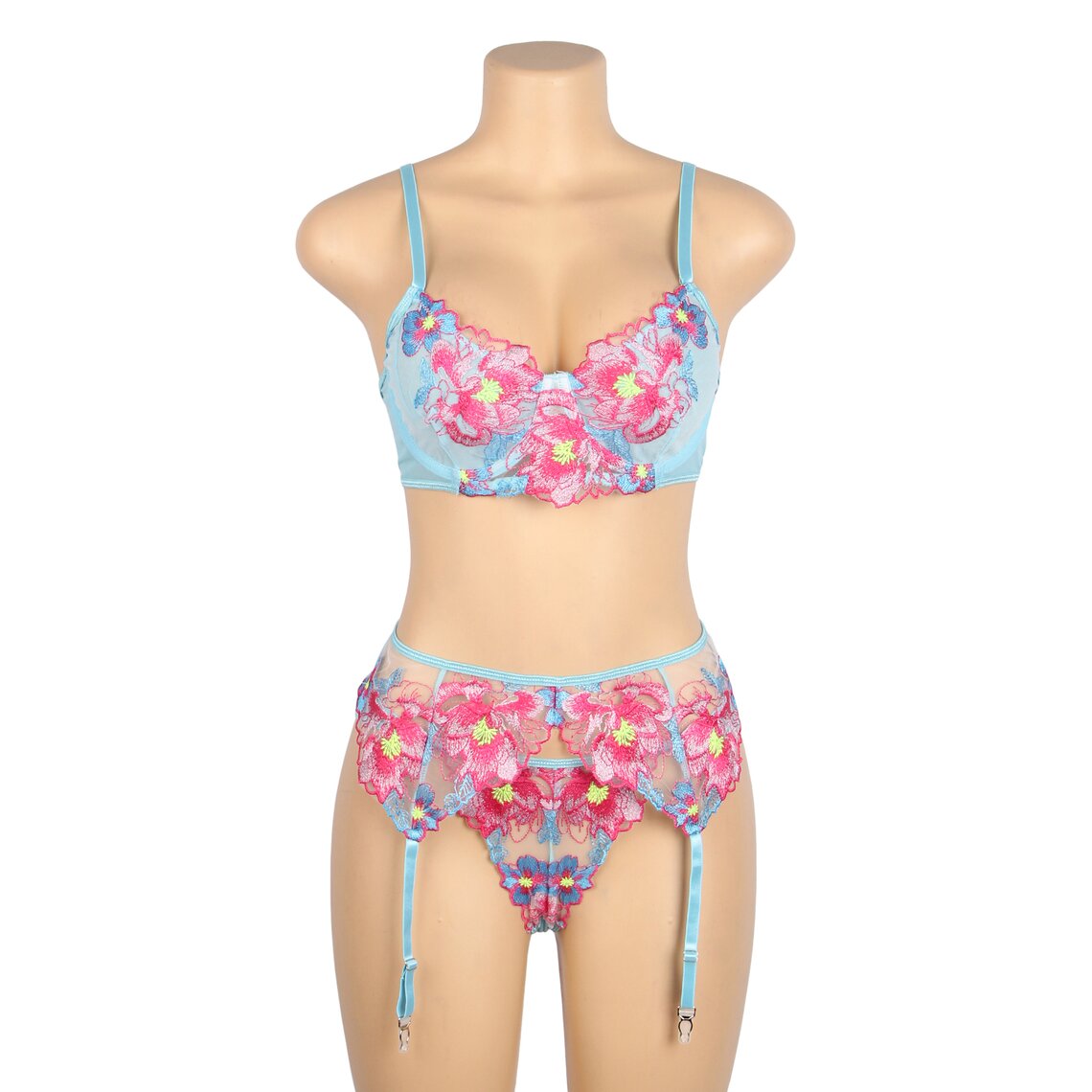 Ein zartes Dessous-Set, das Romantik und Sinnlichkeit mit einem sehr eleganten floralen Design vereint. Dieses Set von Subblime besteht aus einem BH, einem Strumpfhaltergürtel und einem passenden Slip, gefertigt aus halbtransparentem Stoff in Aquagrün und verziert mit auffälligen Blumenstickereien in Rosa- und Blautönen, die die Silhouette mit einem raffinierten Stil betonen.