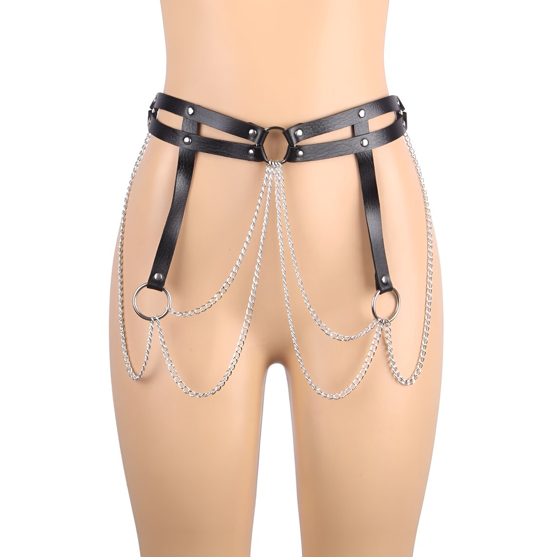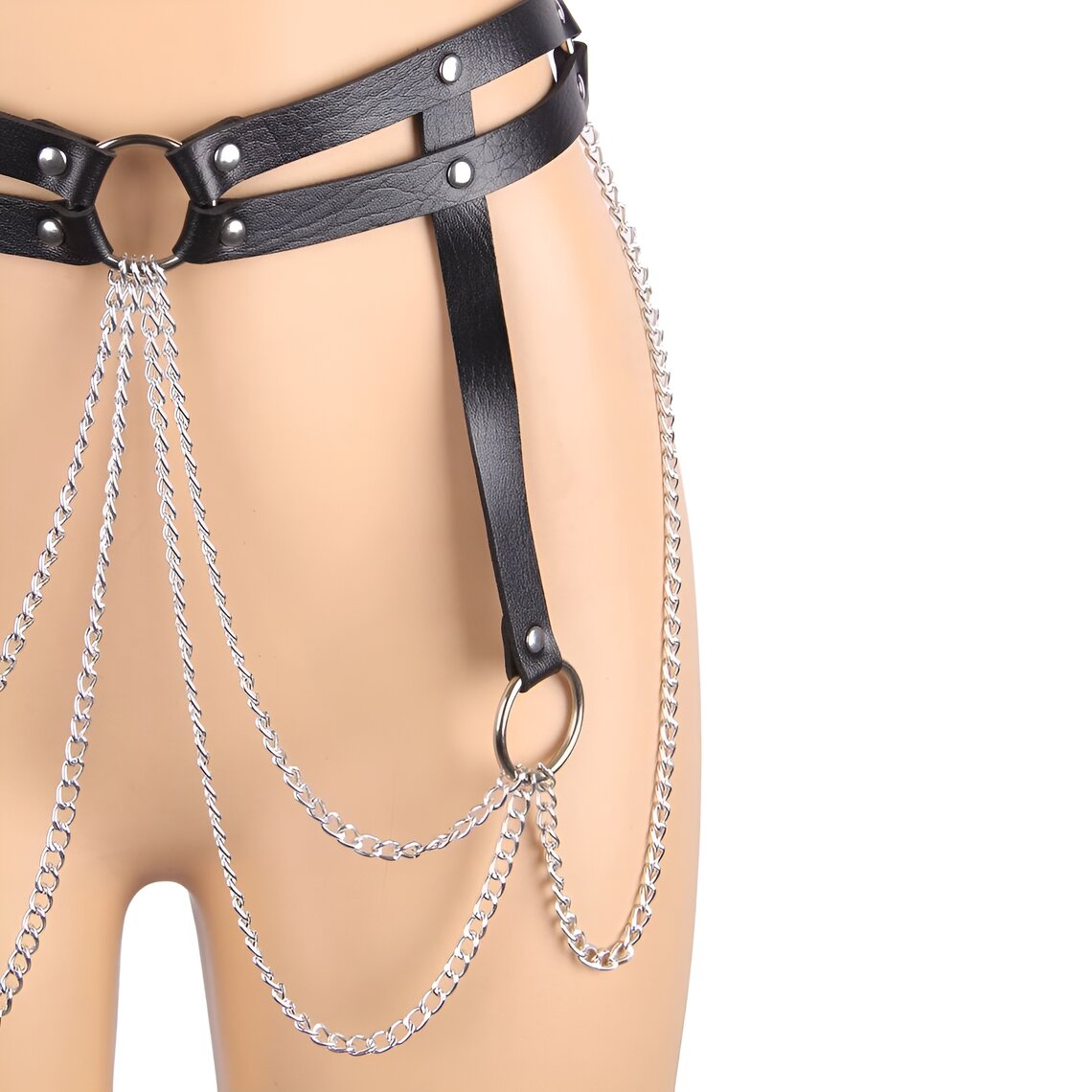 Gefertigt aus hochwertigem Kunstleder, passt sich dieser Gürtel dank seines verstellbaren Designs bequem der Taille an. Seine Struktur umfasst Metallringe und mehrere dekorative Ketten, die elegant herabfallen und einen auffälligen sowie provokativen Look erzeugen.